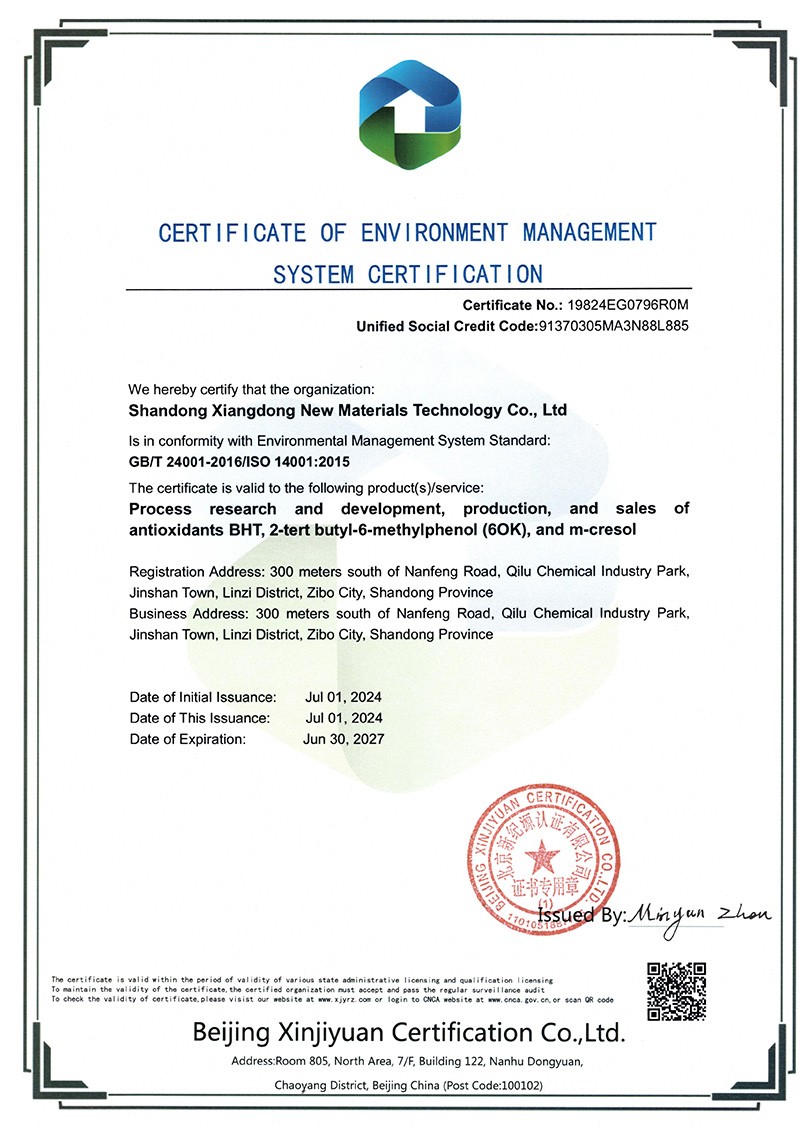 山東祥東新材料科技有限公司1.2萬噸/年6-叔丁基鄰甲(60K)、4-叔丁基鄰甲酚(偏 24 酚)和 4,6-二叔丁基鄰甲酚(偏 246 酚)烷基甲酚項目竣工環(huán)境保護(hù)驗收監(jiān)測報告