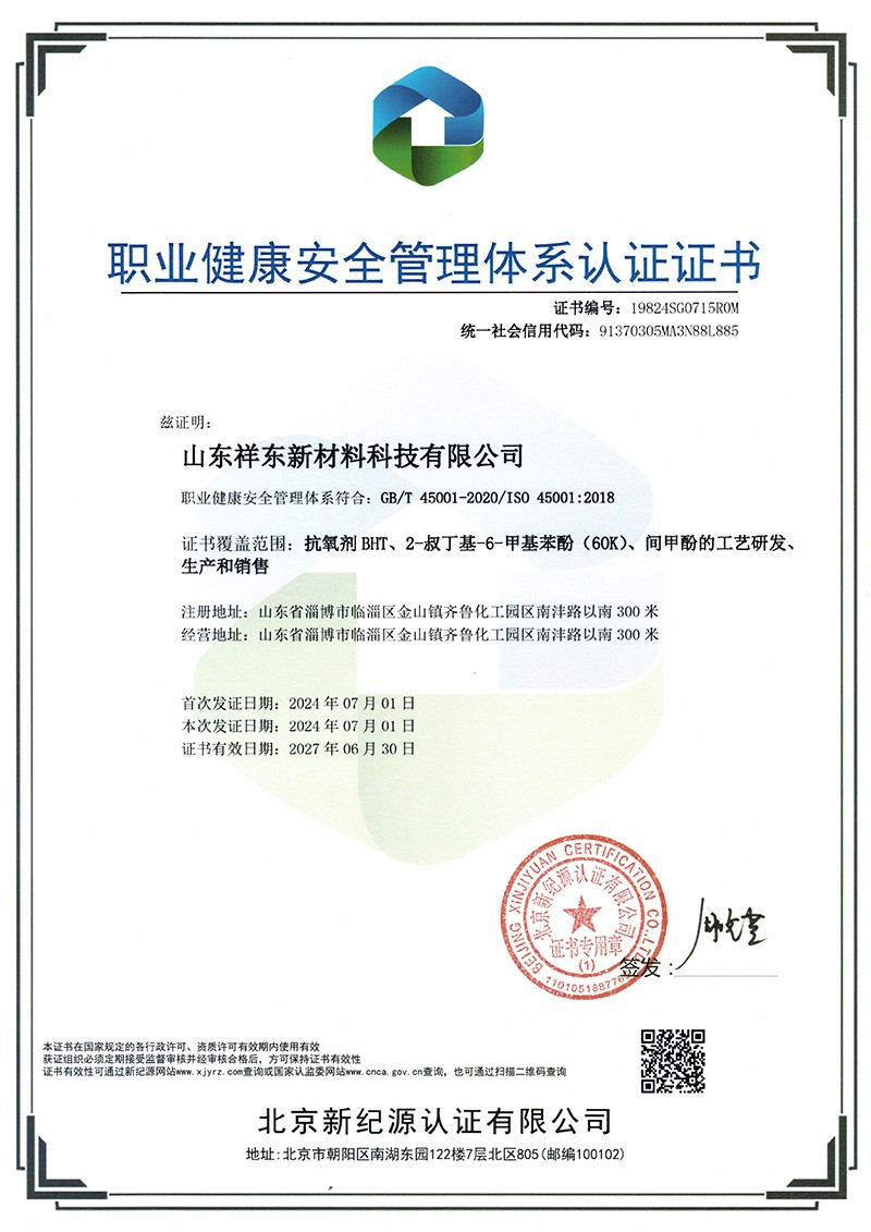 山東祥東新材料科技有限公司1.2萬噸/年6-叔丁基鄰甲(60K)、4-叔丁基鄰甲酚(偏 24 酚)和 4,6-二叔丁基鄰甲酚(偏 246 酚)烷基甲酚項目竣工環(huán)境保護驗收監(jiān)測報告