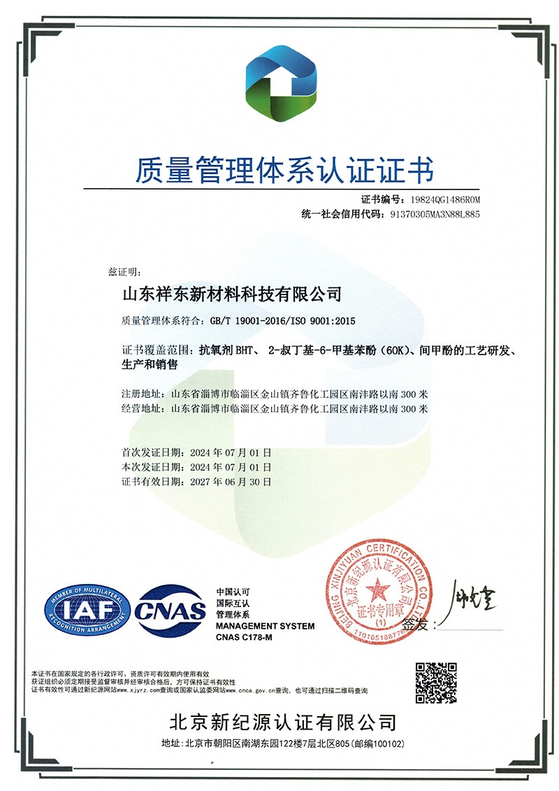 山東祥東新材料科技有限公司1.2萬噸/年6-叔丁基鄰甲(60K)、4-叔丁基鄰甲酚(偏 24 酚)和 4,6-二叔丁基鄰甲酚(偏 246 酚)烷基甲酚項目竣工環(huán)境保護(hù)驗收監(jiān)測報告